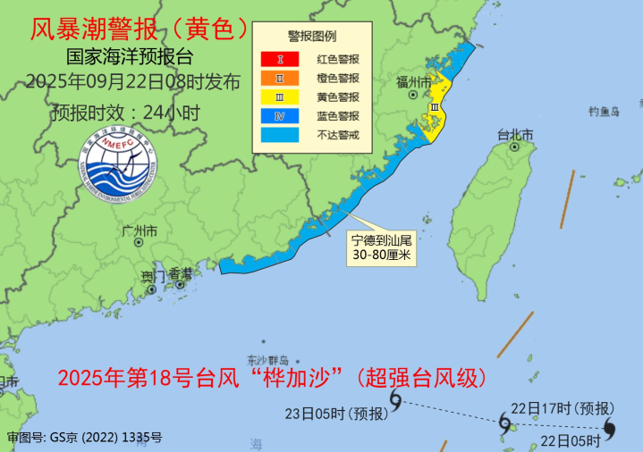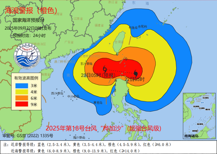 海浪方面,受今年第18号台风“桦加沙”(超强台风级)的影响,预计9月22日上午到23日上午,巴士海峡、南海东北部将出现8到13米的狂浪到狂涛区,台湾海峡将出现4到6米的巨浪到狂浪区,近海海域海浪预警级别为橙色;广东东部、福建南部近岸海域将出现2.5到3.8米的大浪,该近岸海域海浪预警级别为黄色,福建北部、浙江南部近岸海域将出现2到3米的中浪到大浪,该近岸海域海浪预警级别为蓝色。请在上述海域作业的船只注意安全深金优配,沿海各有关单位提前采取防浪避浪措施。